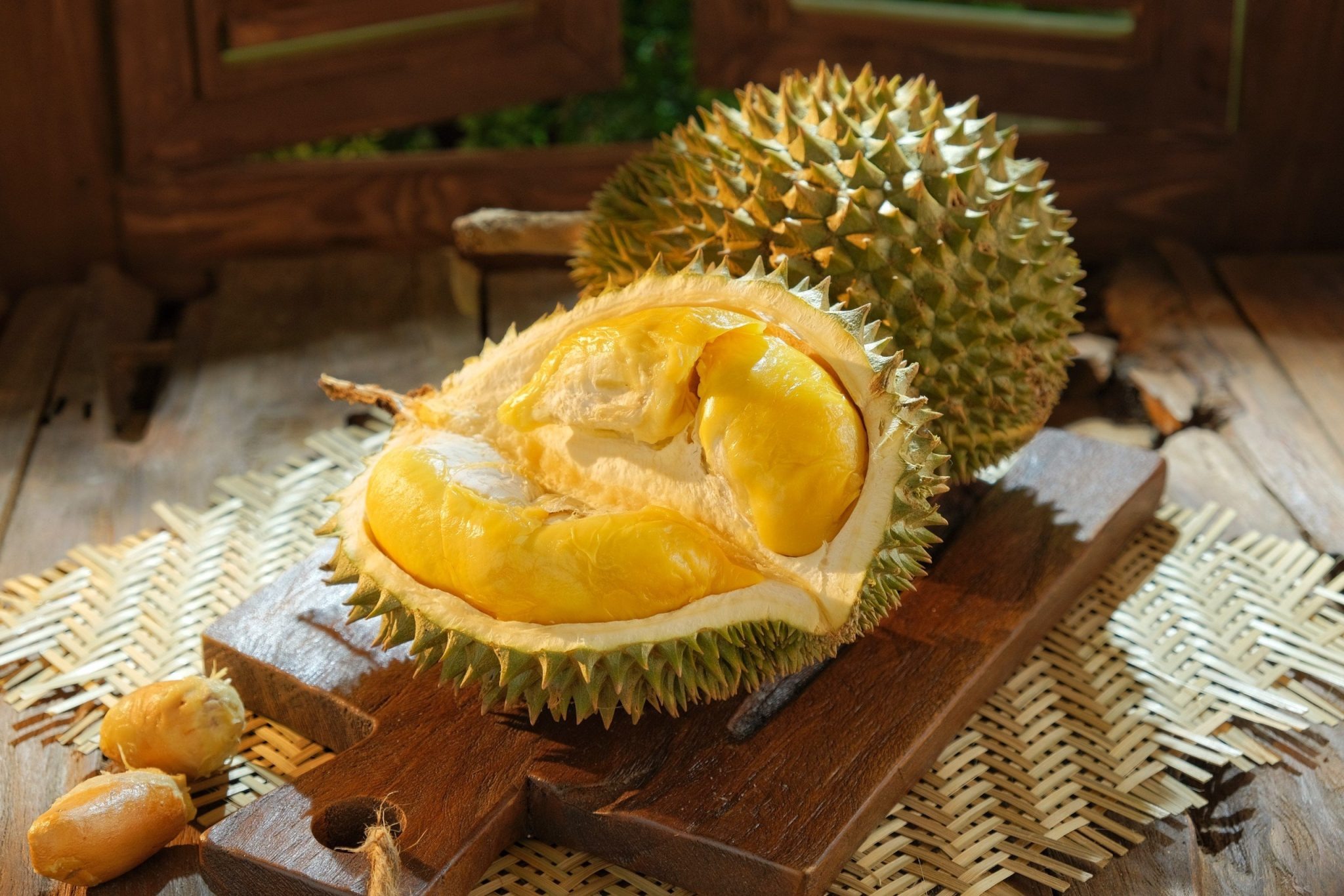 Durian is typically oval or round, with an outer shell that ranges from green to yellow depending on the variety, covered in sharp spines. Each fruit weighs between 1 and 4 kilograms.